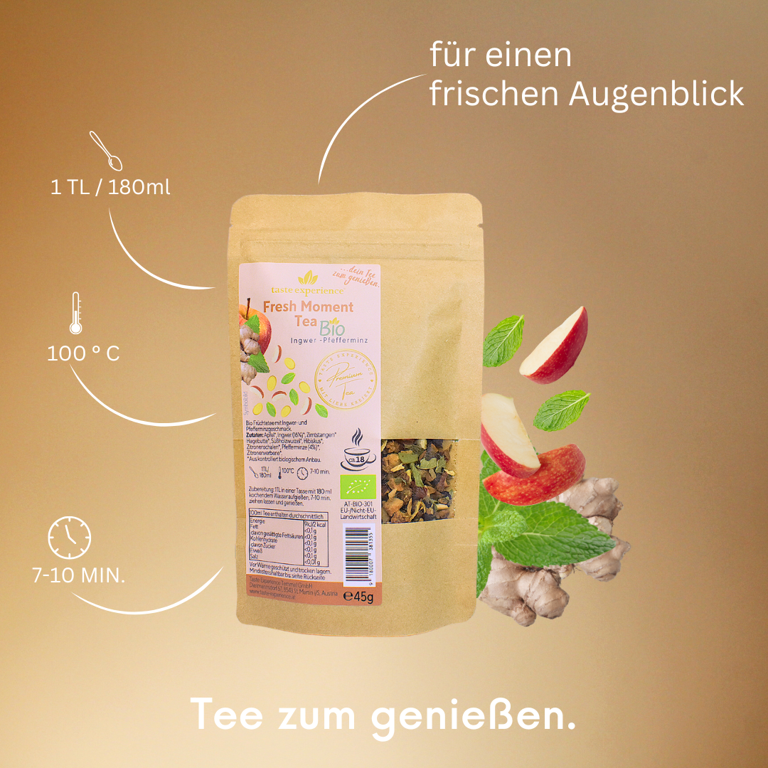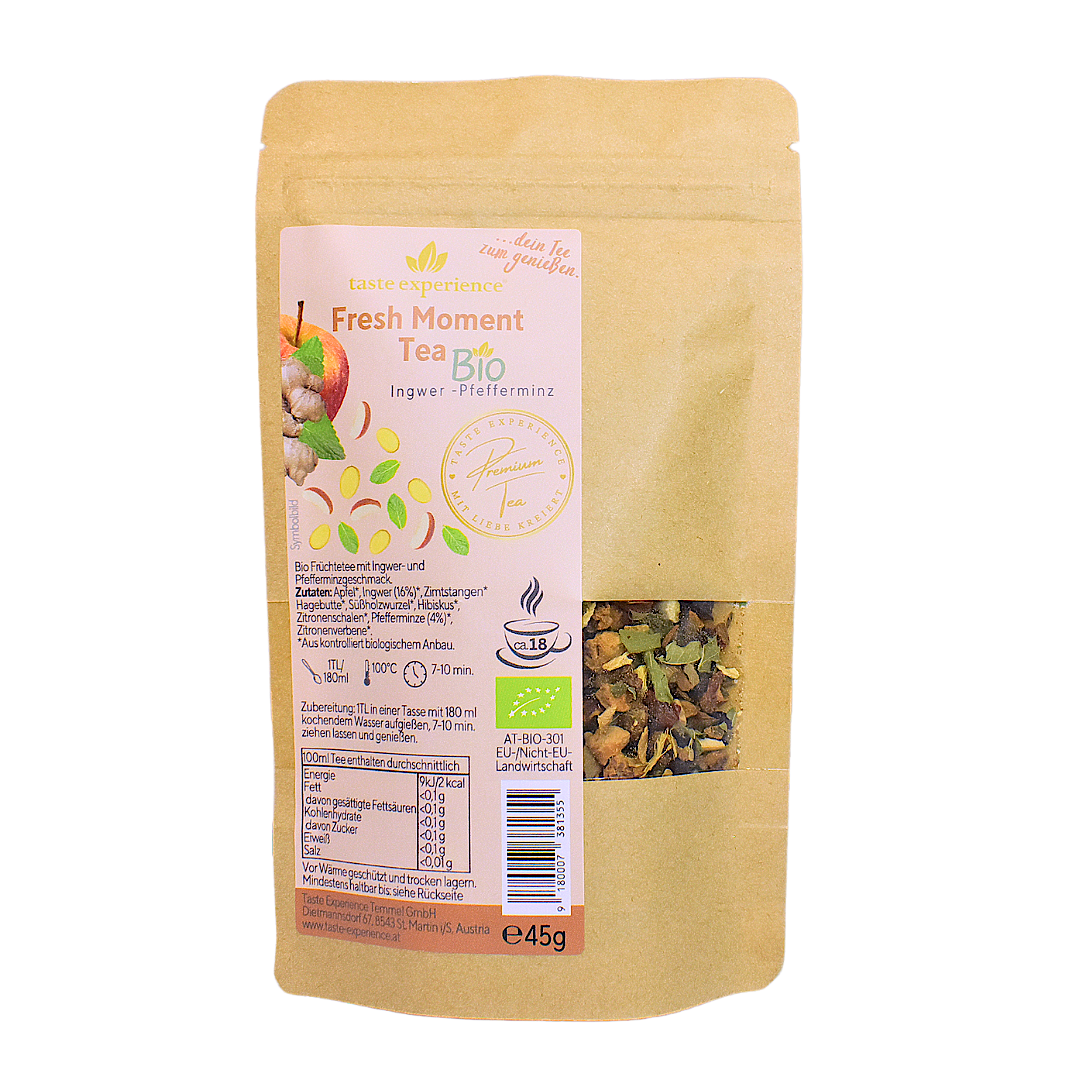 Bio Früchtetee mit Ingwer- und Pfefferminzgeschmack.