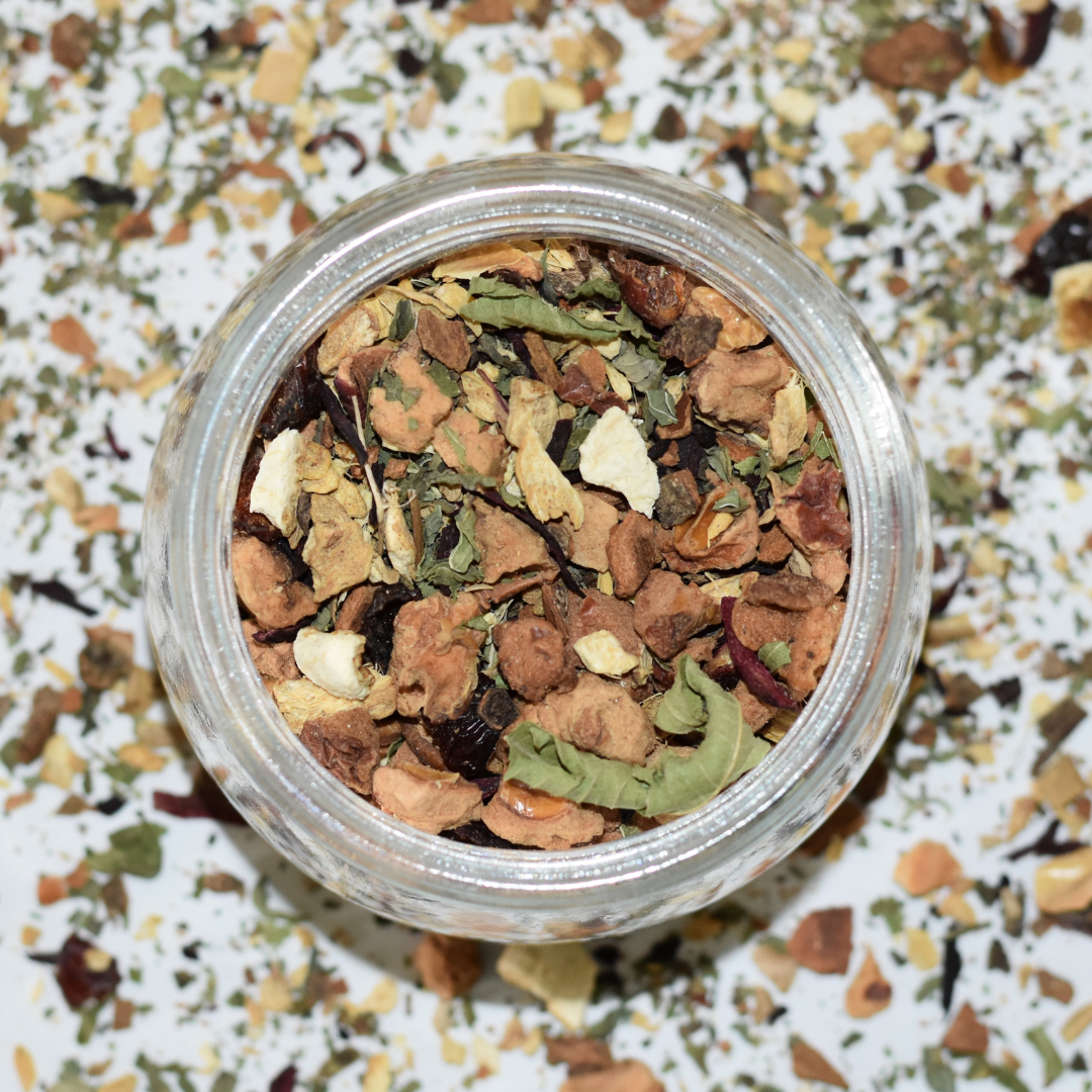 Apfel*, Ingwer (16%)*, Zimtstangen* Hagebutte*, Süßholzwurzel*, Hibiskus*, Zitronenschalen*, Pfefferminze (4%)*, Zitronenverbene*.