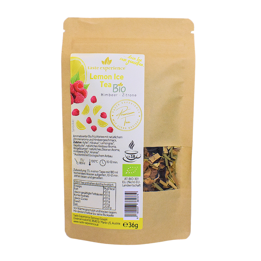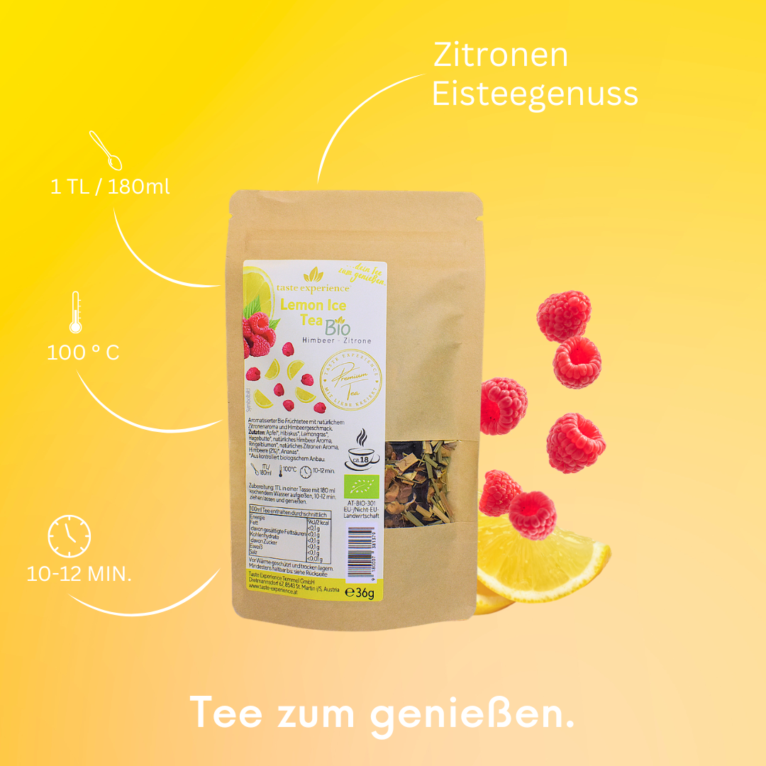 Aromatisierter Bio Früchtetee mit natürlichem Zitronenaroma und Himbeergeschmack.