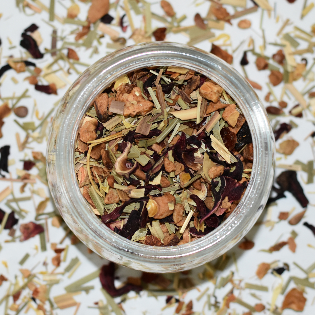 Apfel*, Hibiskus*, Lemongras*, Hagebutte*, natürliches Himbeer Aroma, Ringelblumen*, natürliches Zitronen Aroma, Himbeere (2%)*, Ananas*.