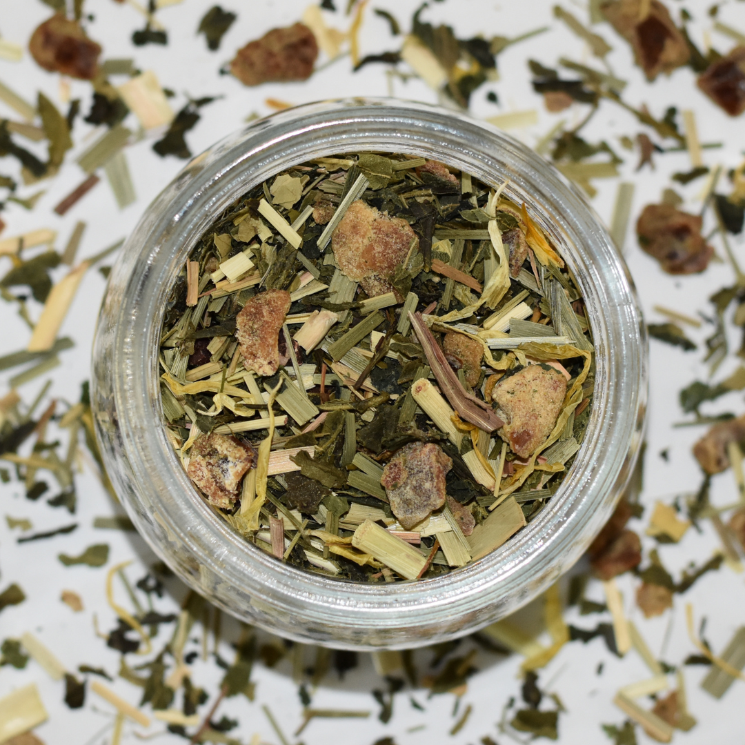 Dattel getrocknet (Dattel*, Reismehl*) (45%), Lemongras*, Grüner Tee China Sencha*, Brennnessel (11%)*, Mate grün*, Kakaokernbruch*, Zitronenschalen (3%)*, natürliches Grapefruit Aroma, Ringelblumen*, natürliches Zitronen Aroma, Vanille Extrakt*.